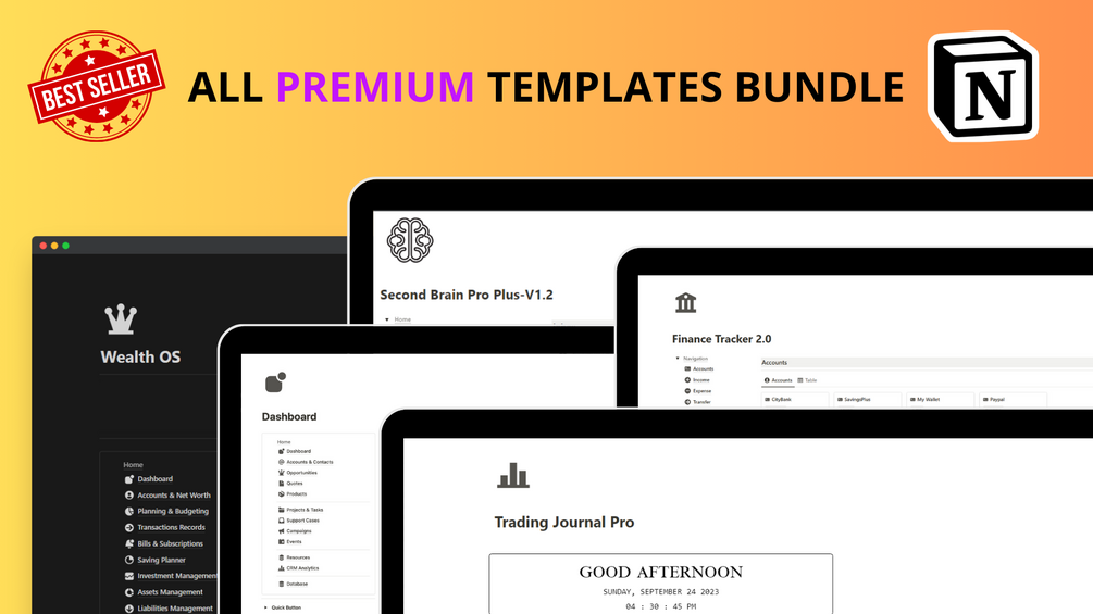 ✅ Trading Journal PRO ($45 value) ✅ Second Brain Pro Plus ($29 value) ✅ Get Things Done (GTD) + Second Brain Template ($29 value) ✅ Crypto Trading Journal and Airdrop Tracker ($29 value) ✅ Notion Finance Tracker Pro ($29 value) ✅ Freelance Pro: The All-in-One Toolkit for Freelancers ($29 value) ✅ Wealth OS Notion Template ($59 value) ✅ CRM Dashboard Pro ($19 value) ✅ Workout Tracker Pro ($29 value) ✅ Notion Content Creator Studio Pro ($29 value)